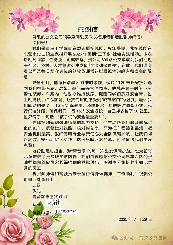 圓夢(mèng)高考|“你們?nèi)σ愿埃覀內(nèi)套o(hù)航!”為保障高考期間交通順暢有序,東營(yíng)市公交集團(tuán)以高度的責(zé)任感提前布局、周密安排,傾力打造安全、高效的送考保障體系,誓為全市考生鋪就一條平安赴考的坦途。市公交集團(tuán)選拔駕駛經(jīng)驗(yàn)豐富且服務(wù)意識(shí)突出的優(yōu)秀駕駛員...[查看更多>>]更多>>> 最新公告